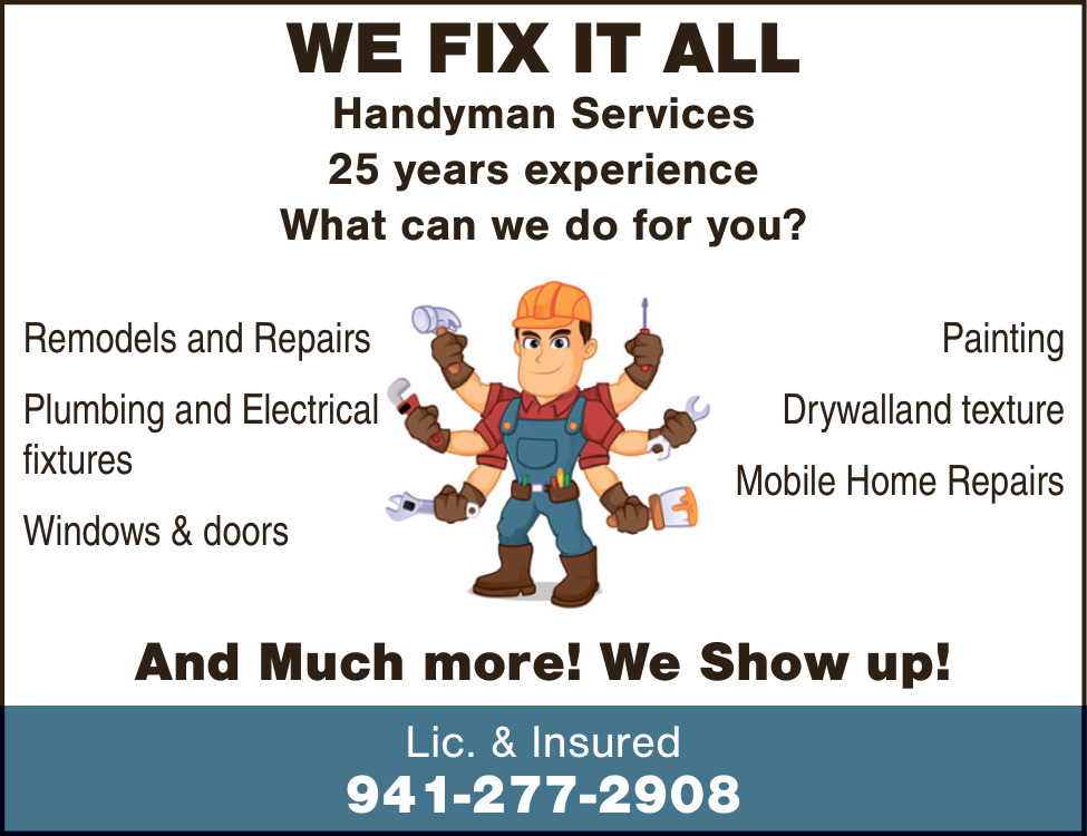 Apr 07, 2026. 941-277-2908 Handyman Service Ads from Your Sun Services